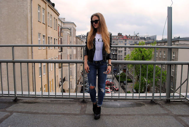 W dzisiejszym poście pokaże Wam ponadczasowy zestaw - skórzana kurtka i podarte jeansy. Elegancki, luźny zestaw na co dzień. Do zachowania kontrastu założyłam białą bluzkę z kontrowersyjnym napisem, która kupiłam rok temu. Do tego moje ukochane koturny i czarne, "kocie" okulary.